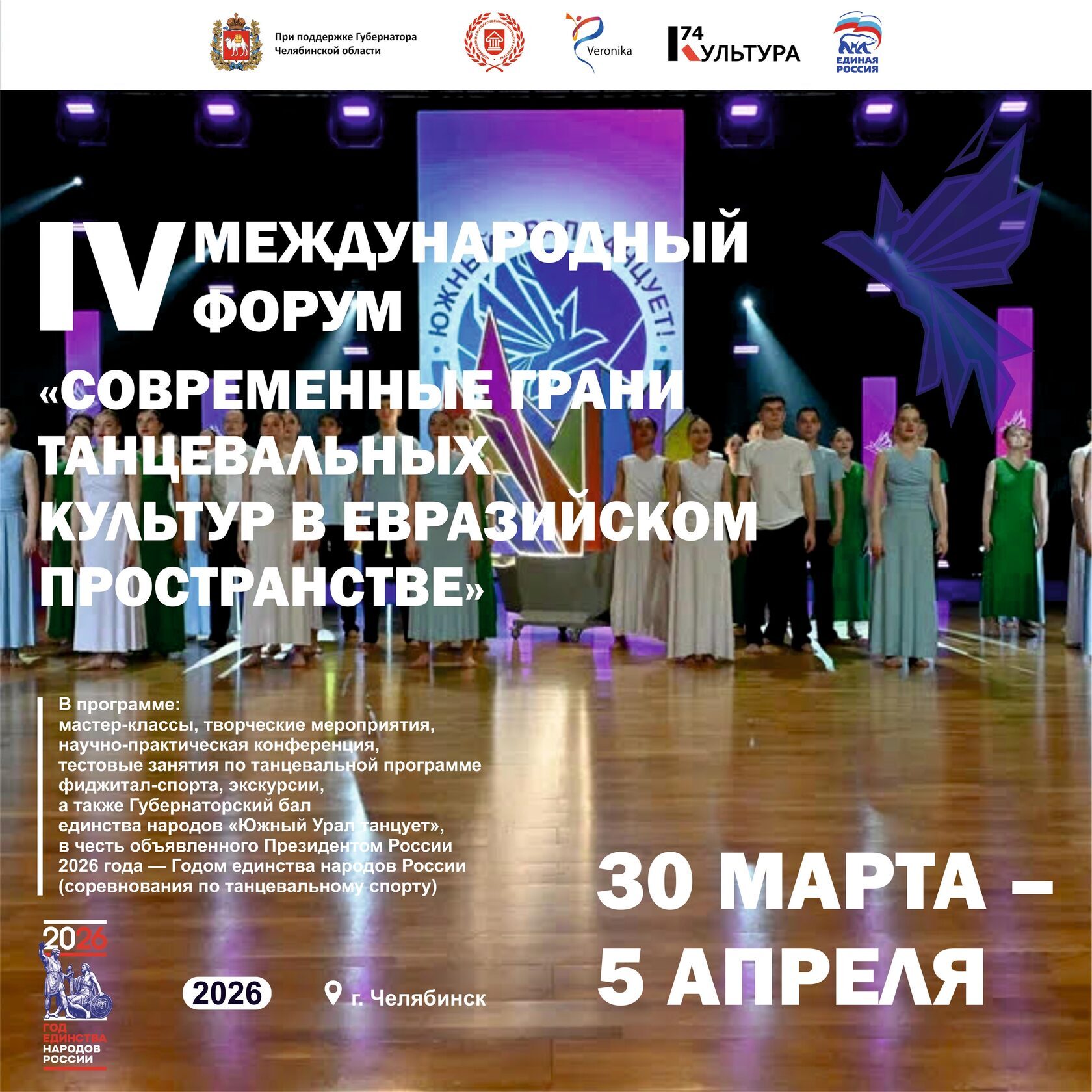 В столице Южного Урала с 30 марта по 5 апреля пройдет IV Международный форум «Современные грани танцевальных культур в Евразийском пространстве», апогеем которого станет Губернаторский бал Единства народов «Южный Урал танцует».